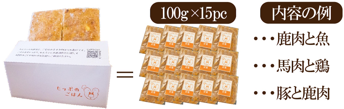 肉(鶏むね・猪・鹿・豚ヒレ)・さつま芋・かぼちゃ・アジ・発芽玄米・卵黄・ブロッコリー・鶏レバー・米麹・(だし/昆布・イワシ粉)・ヤギホエイ・風化貝カルシウム・サチャインチオイル・白ごま・きな粉・殺菌乳酸菌・ブルーベリー茎・イカ軟骨抽出成分・酵母