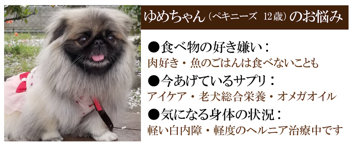 12歳のゆめちゃん、ペキニーズらしい「美食家(お肉大好き!)」な一面がありつつ、サプリメントもしっかり摂っていて、飼い主様の深い愛情を感じます。